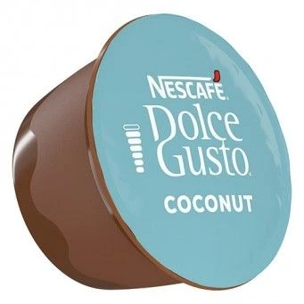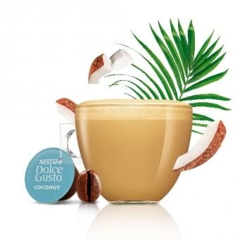 Dolce Gusto Coconut Macchiato Vegan, een gevoel van een heerlijk tripje naar de tropen, een exotische koffie, geroosterde noten en de volle smaak van koffie uit Zuidoost Azie, in combinatie met de zachte maar frisse smaken van kokos, lactose-vrij. Intensiteit 5, medium.