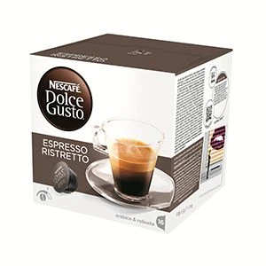 Dolce Gusto Espresso Ristretto is een lekker sterk kopje espresso. De Espresso Ristretto bevat minder water dan een normale espresso, waardoor er veel smaakdragers vrijkomen (oliën en gekarameliseerde suikers). Minder cafeine dan een espresso. Dolce Gusto capsules: Inhoud: 16 capsules