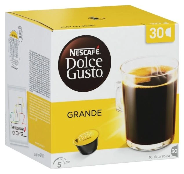 Dolce Gusto Grande XL, van 100% pure arabica koffiebonen: een heerlijke specialiteit voor alle koffieliefhebbers. Grande XL is een ideale hoeveelheid voor een grote kop koffie, om iedere dag van te genieten. De XL verpakking is met 30 capsules een grotere verpakking en per capsule iets voordeliger dan de reguliere verpakking van 16. Dolce Gusto capsules: Inhoud: 30 capsules
